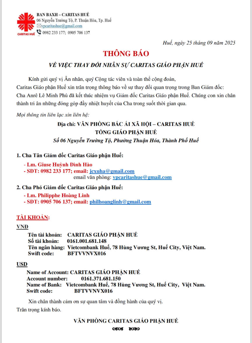THÔNG BÁO: VỀ VIỆC THAY ĐỔI NHÂN SỰ CARITAS GIÁO PHẬN HUẾ